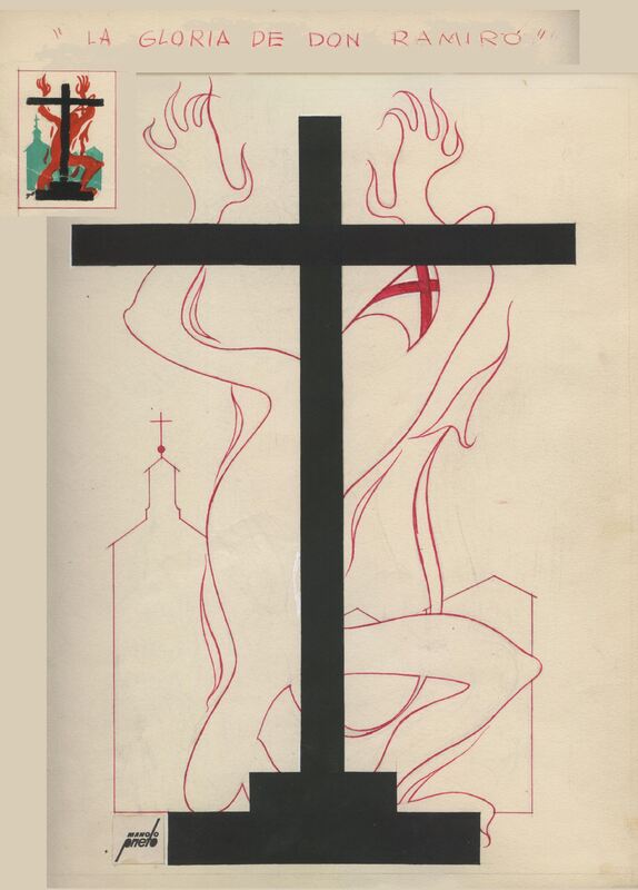 Bajo el título “la gloria de Don Ramiro” en letras rojas se ha representado una gran cruz negra. Detrás destaca la silueta en líneas rojas de una figura que se contornea desesperadamente. En la esquina superior de la izquierda destaca, en un pequeño cuadrado el mismo dibujo en el que destacan los colores verde, rojo y negro. El dibujo está firmado.Original para la portada de Novelas y cuentos