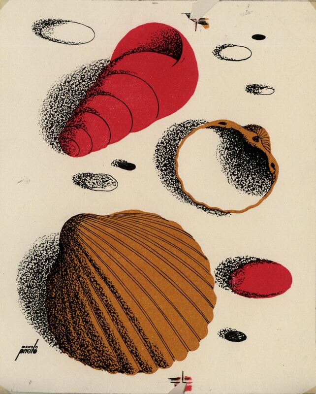 Sobre un fondo claro en esta composición, en la que se puede ver la firma del artista, se han representado tres conchas de mar, una roja y alargada y las otras marrones. A su alrededor se ven algunas piedras blancas y rojas.Prueba de imprenta. Ilustración realizada para la revista semanal Novelas y Cuentos. Titulo: Las conchas purpúreas. Autor: R. L. Goldan. Nº publicado: 1153. Fecha: 14-06 -1953. Tomo NC.: 43.