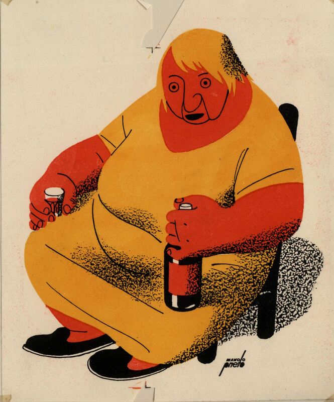 - Sobre una silla está sentada una mujer rubia, con la piel rojiza, corpulenta, con un vestido amarillo, zapatillas negras y una botella en su mano izquierda. Se puede vislumbrar la firma del pintor en la composición.Prueba de imprenta. Ilustración realizada para la revista semanal Novelas y Cuentos. Titulo: Autor: Nº publicado: Fecha: Tomo NC.: