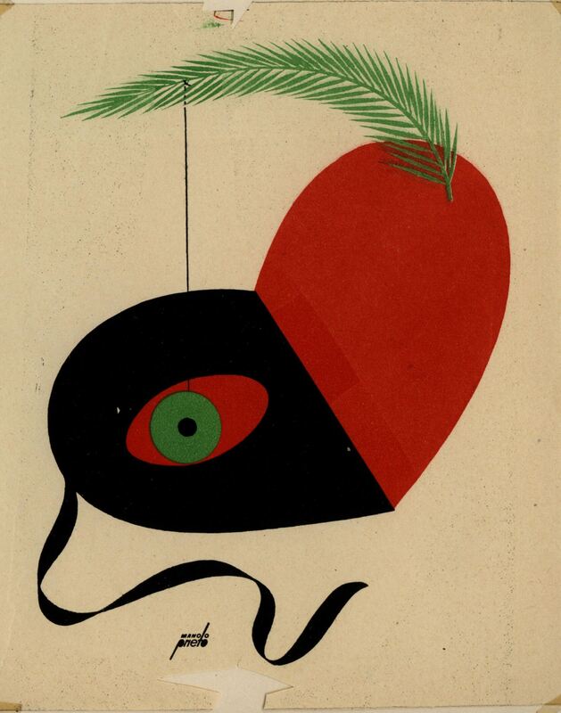 En este dibujo, en el que está presente la firma del pintor, se ha representado un original corazón. Su mitad derecha es de color negro en el que destaca un ojo verde y rojo como también una cinta de color negro. En su mitad roja se ve una pluma verde.Prueba de imprenta. Ilustración realizada para la revista semanal Novelas y Cuentos. Titulo: El apache. Autor: Paul Bourget. Nº publicado: 1079. Fecha: 13-01-1952. Tomo NC.: 42.