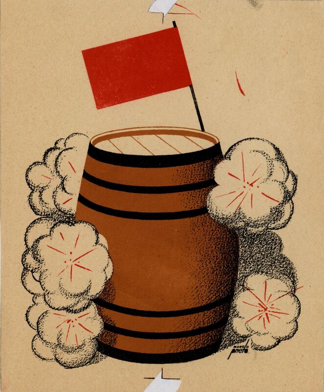 - La imagen de un barril marrón y en posición vertical con una bandera roja en la parte superior y a su alrededor manchas blancas es el centro de esta composición firmada por el artista.Prueba de imprenta. Ilustracion realizada para la revista semanal Novelas y Cuentos. Titulo: Autor: Nº publicado: Fecha: Tomo NC.: