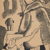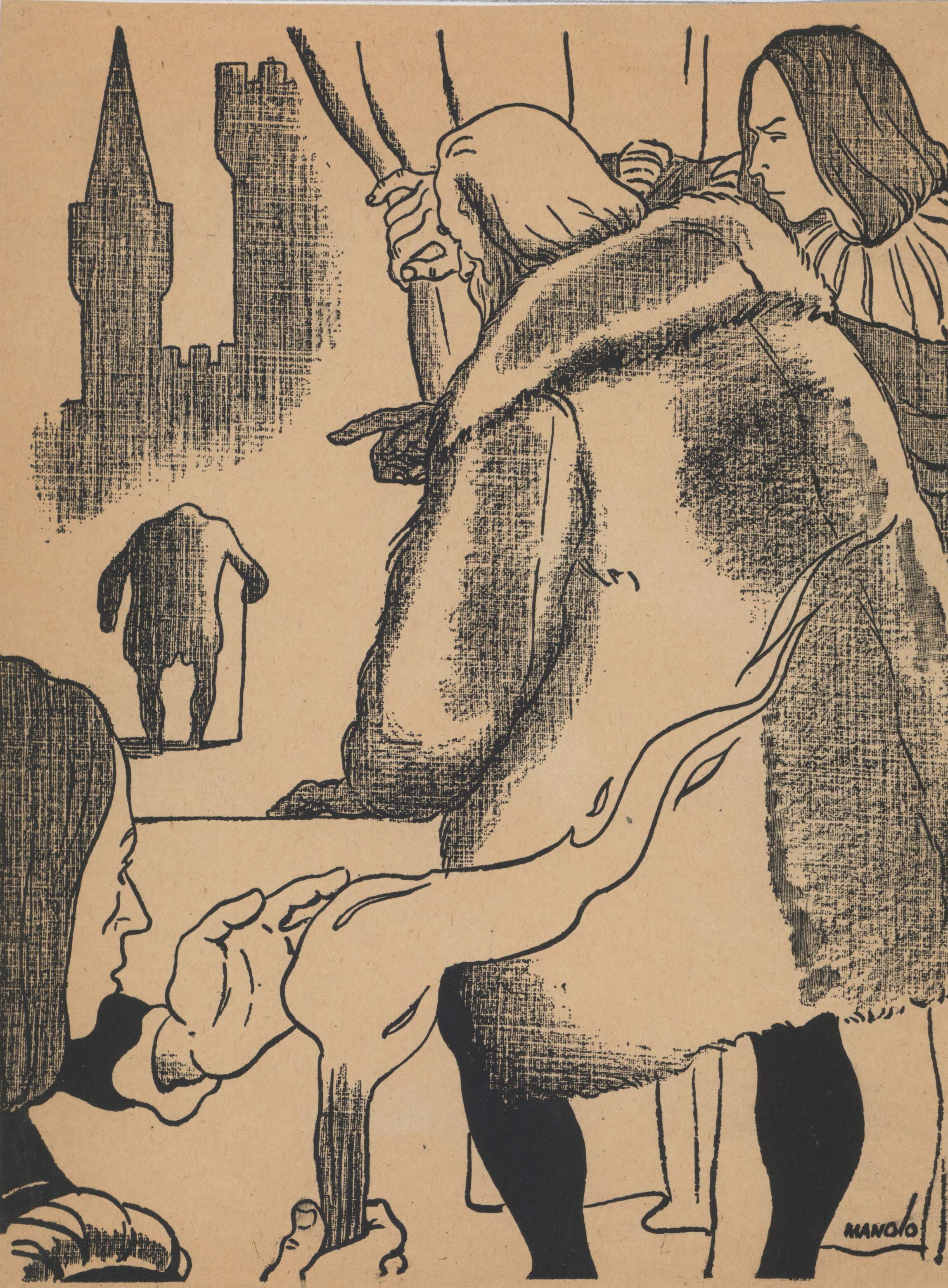 En este dibujo firmado y en el que destacan las líneas en tonos grises se ven a dos personajes de espalda que corren una cortina mientras un tercero porta una antorcha. Espían a un hombre que también se ve de espalda caminando en un segundo plano en el que destaca el perfil de una alta torre de un castillo.Prueba de imprenta. Ilustración realizada para la revista semanal Novelas y Cuentos. Titulo: Autor: Nº publicado: Fecha: Tomo NC.:
