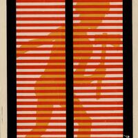 Detrás de una ventana configurada por medio de líneas rojas horizontales y tres líneas negras verticales, dos a cada lado y una en medio, destaca la silueta de una figura femenina de color amarillo con un hacha en una de sus manos. El dibujo está firmado por el artista.Prueba de imprenta. Ilustración realizada para la revista semanal Novelas y Cuentos. Titulo: La casa de la muerta. Autor: A. Abbor. Nº publicado: 1236. Fecha: 16-01-1955. Tomo NC.: 60.