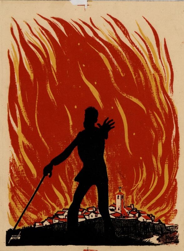 En el paisaje de un pueblo o ciudad en llamas, destacando el color rojo y amarillo, como se ve en el fondo del dibujo, se vislumbra una figura con la silueta negra gesticulando con su brazo izquierdo como si hiciera un llamamiento mientras lleva en su mano derecha una bengala. La composición está firmada por el artista.Prueba de imprenta. Ilustración realizada para la revista Novelas y Cuentos. Titulo: El mayorazgo de Labraz; Autor: Pio Baroja; Nº publicado: 1024 Fecha: 24-12-50; Tomo NC.: 25.