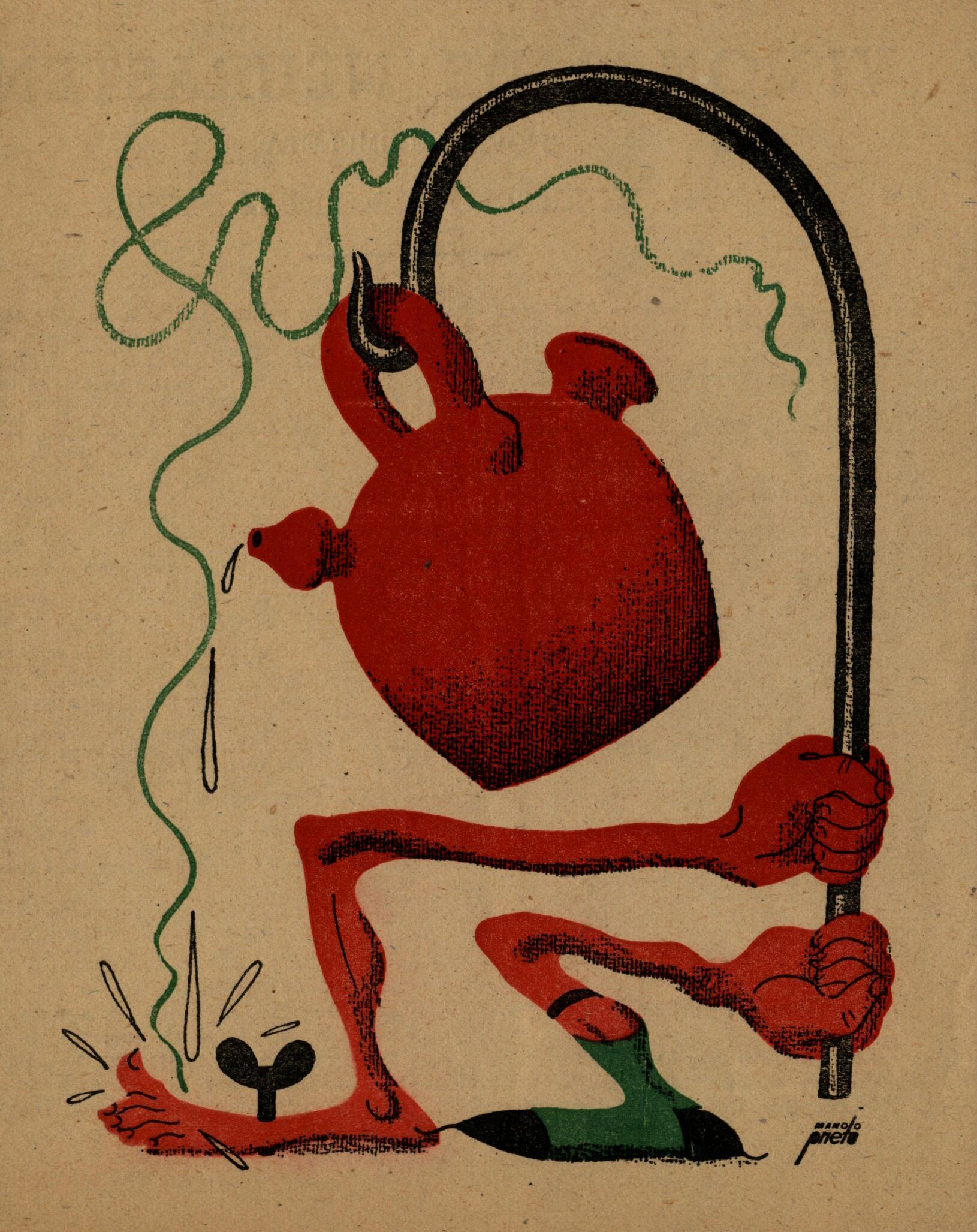 - Un cántaro rojo se encuentra sujeto por un gancho mientras ligeramente inclinado deja caer algunas gotas del líquido que lleva en su interior. Dos brazos rojos, surgidos de la tierra, sujetan el gancho oscuro. Líneas ondulantes de color verde se sitúan alrededor de las figuras. El dibujo está firmado.“Repetida con la ficha nº 132.”