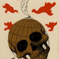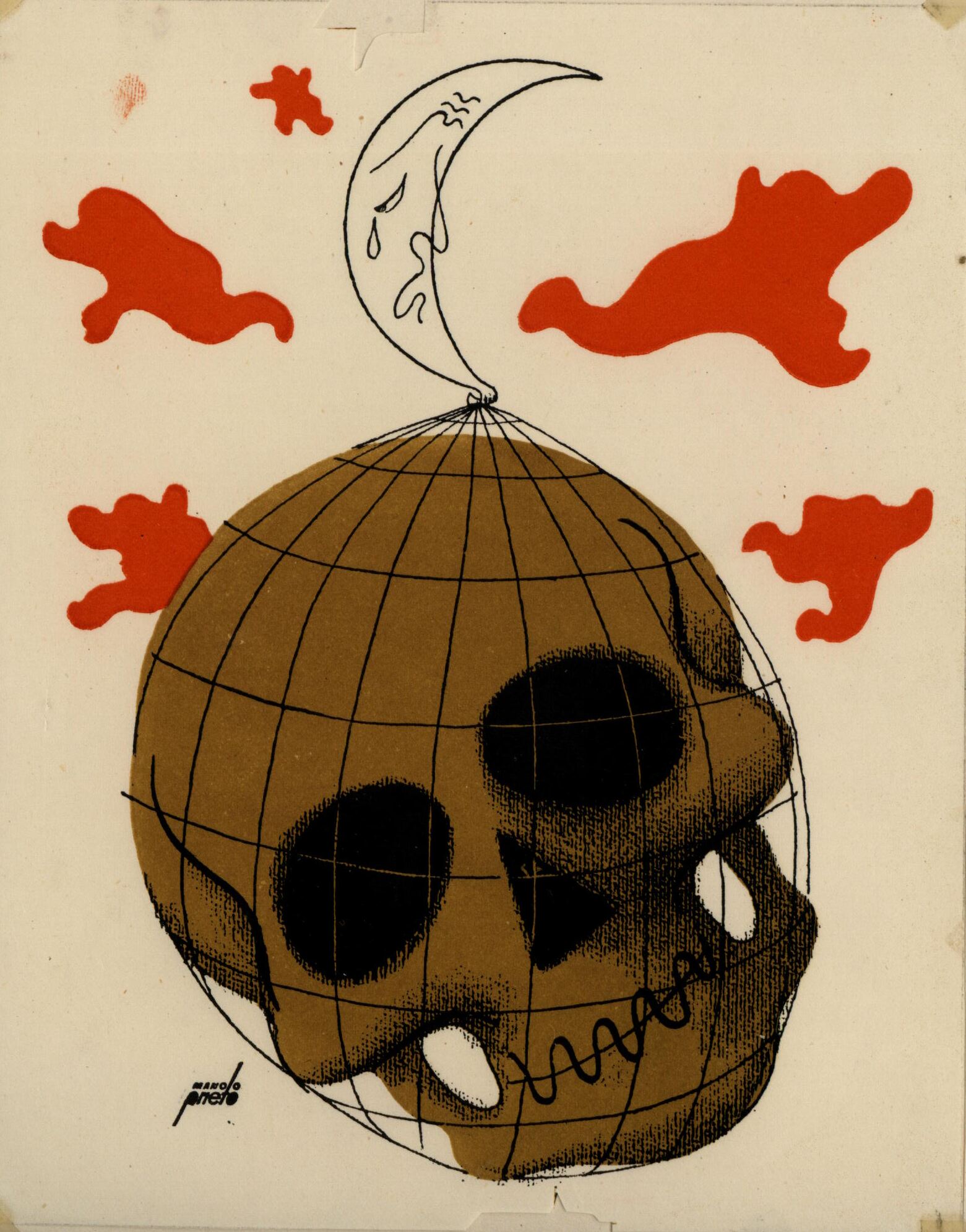 En el centro de la composición, firmada por el pintor, destaca la imagen de una calavera marrón envuelta en una red. Por encima de la calavera se vislumbra una luna blanca de aspecto triste y a su alrededor, también por la parte superior, unas manchas rojasPrueba de imprenta. Ilustración realizada para la revista semanal Novelas y Cuentos. Titulo: La muerte de la tierra. Autor: J. H. Rosny (mayor). Nº publicado: 995. Fecha: 04-06-1950. Tomo NC.: 53.