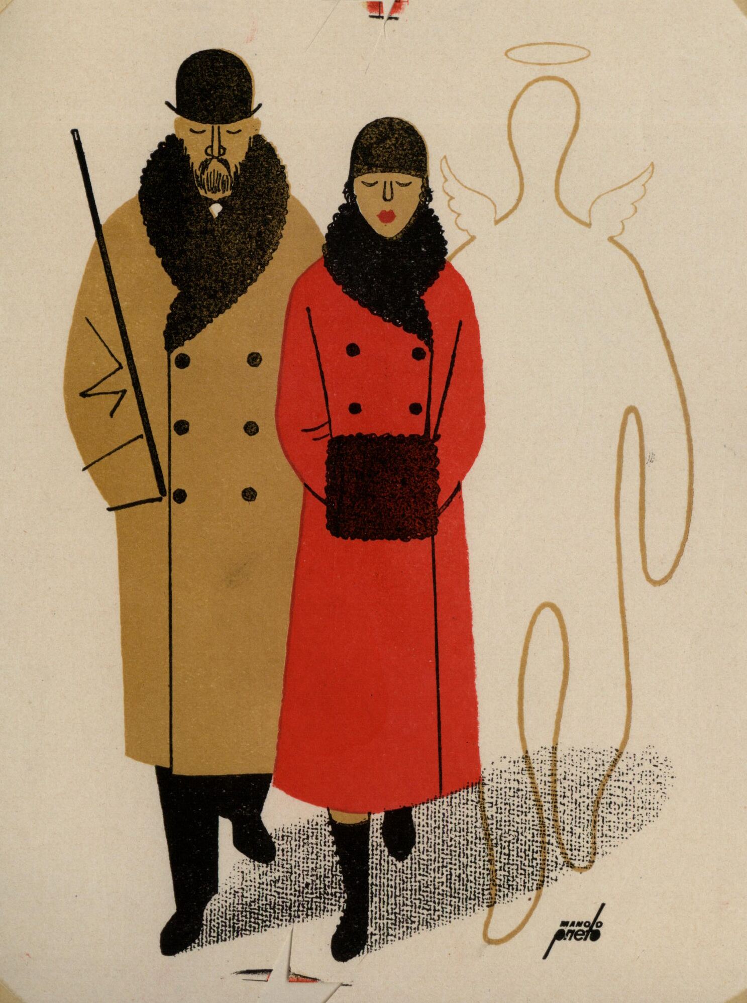 Una pareja con largos abrigos de invierno, el hombre con uno en color amarillento y la mujer con otro de color rojo, pasea acompañada por la imagen de un ángel con la silueta amarilla que se encuentra al lado de la mujer. El dibujo está firmado.Prueba de imprenta. Ilustración realizada para la revista semanal Novelas y Cuentos. Titulo: Los dos amigos. Autor; I. Turgueniev. Nº publicado: 22-07-1956. Fecha: 22- 07-1956.