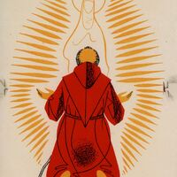 En este dibujo firmado se muestra de rodillas a un santo con el hábito rojo y los pies descalzos orando ante la imagen de la Virgen cuya silueta es amarilla y de cuya figura se desprenden rayos luminosos. La figura se encuentra de espalda.Prueba de imprenta. Ilustración realizada para la revista semanal Novelas y Cuentos. Titulo: El monje blanco. Autor: Eduardo Marquina. Nº publicado: 1192. Fecha: 14-03 1954. Tomo NC. 44