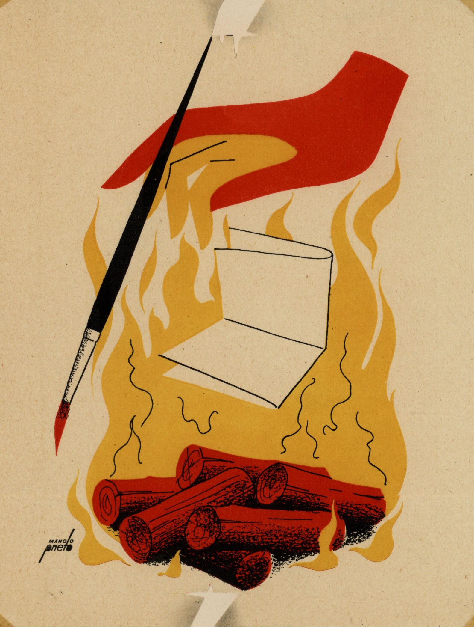 Cuatro elementos configuran este dibujo firmado: una mano que surge en la parte superior, un pincel negro, una hoja de papel en blanco y una hoguera con llamas de color amarillo.Prueba de imprenta. Ilustración realizada para la revista semanal Novelas y Cuentos. Titulo: El desquite. Autor: Matilde Aigueperse. Nº publicado: 1101. Fecha: 15-06- 1952. Tomo NC. 55.