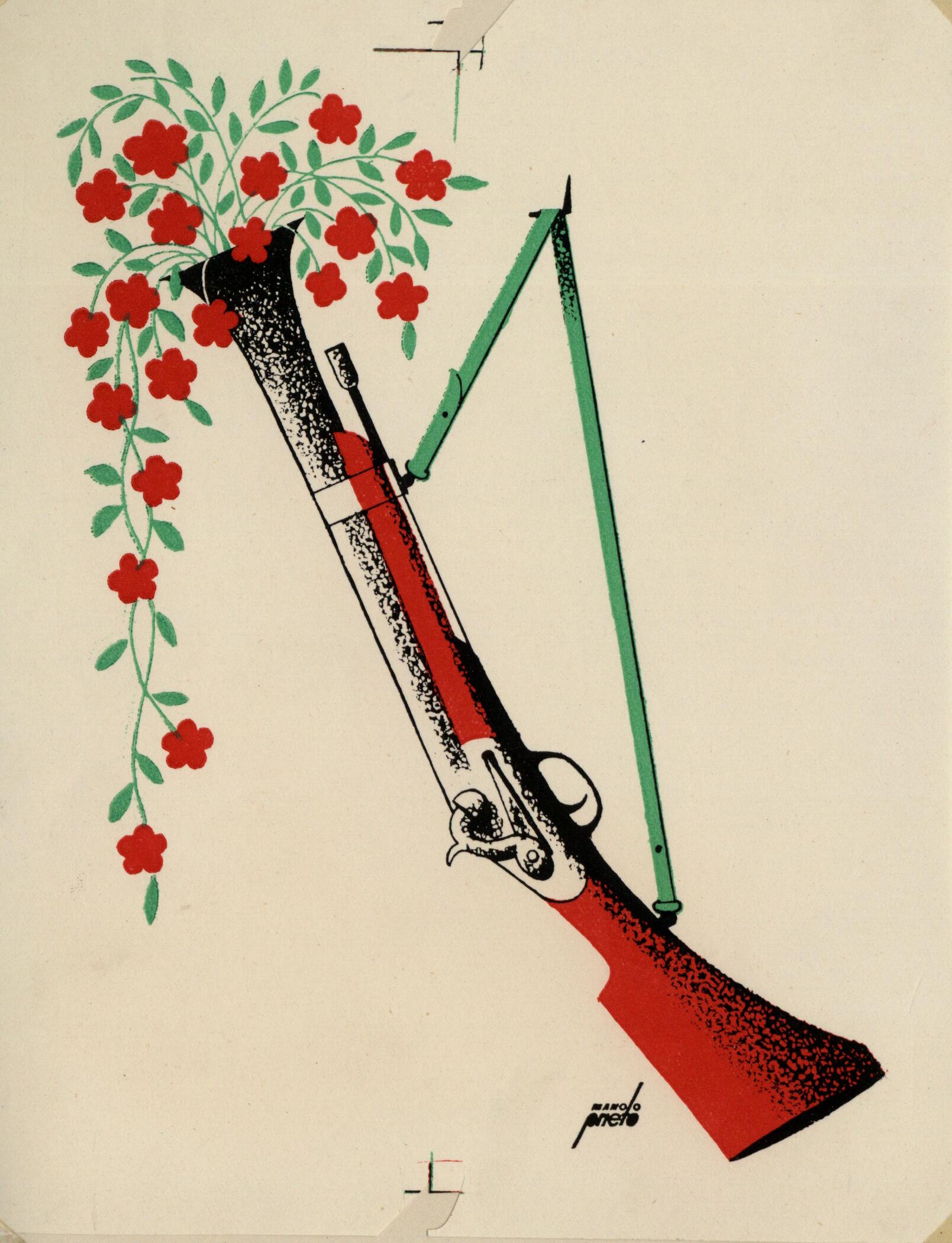 En el dibujo firmado destaca una escopeta colgada con una cinta verde y en una posición vertical. De su cañón de tiro surge un ramillete de unas flores rojas con hojas verdes.Prueba de imprenta. Ilustración realizada para la revista semanal Novelas y Cuentos. Titulo: El hijo de un ladrón. Autor: Jules Mary. Nº publicado: 1163. Fecha: 23-08-1953. Tomo NC. 35.
