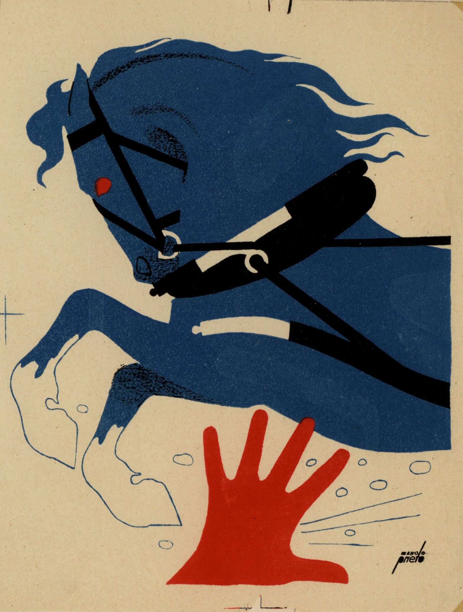 Dos elementos configuran este dibujo firmado: un caballo que se muestra de perfil de color azul y levantando sus patas delanteras hacia arriba y una mano roja, en la parte inferior, intentando detener al caballo.Prueba de imprenta. Ilustración realizada para la revista semanal Novelas y Cuentos. Titulo: Autor: Nº publicado: Fecha: Tomo NC.