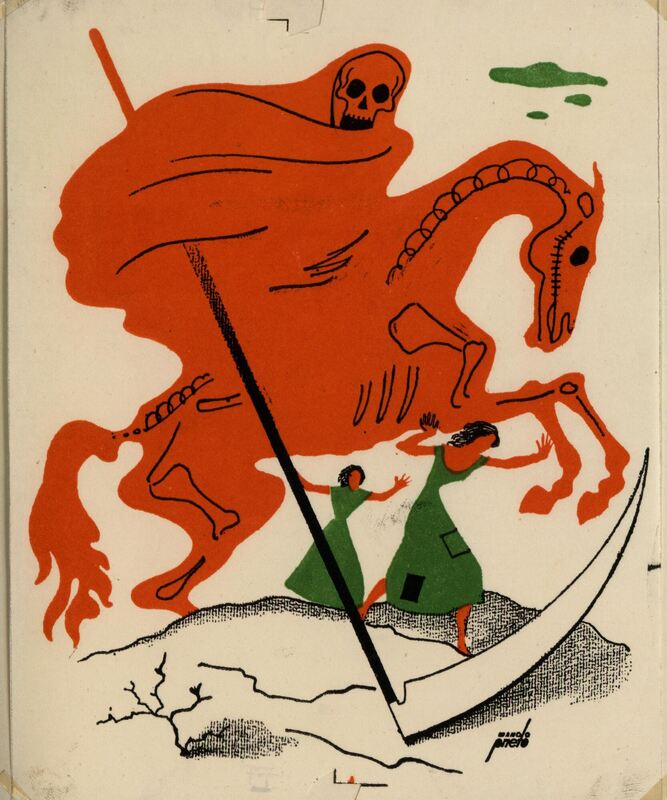 En este dibujo firmado aparecen dos muchachas con sus vestidos verdes y pelos negros corriendo ante la persecución de la muerte representada en este caso sobre un caballo llevando su guadaña y toda la figura de color rojo.Prueba de imprenta. Ilustración realizada para la revista semanal Novelas y Cuentos. Titulo: Autor: Nº publicado: Fecha: Tomo NC.