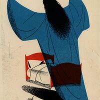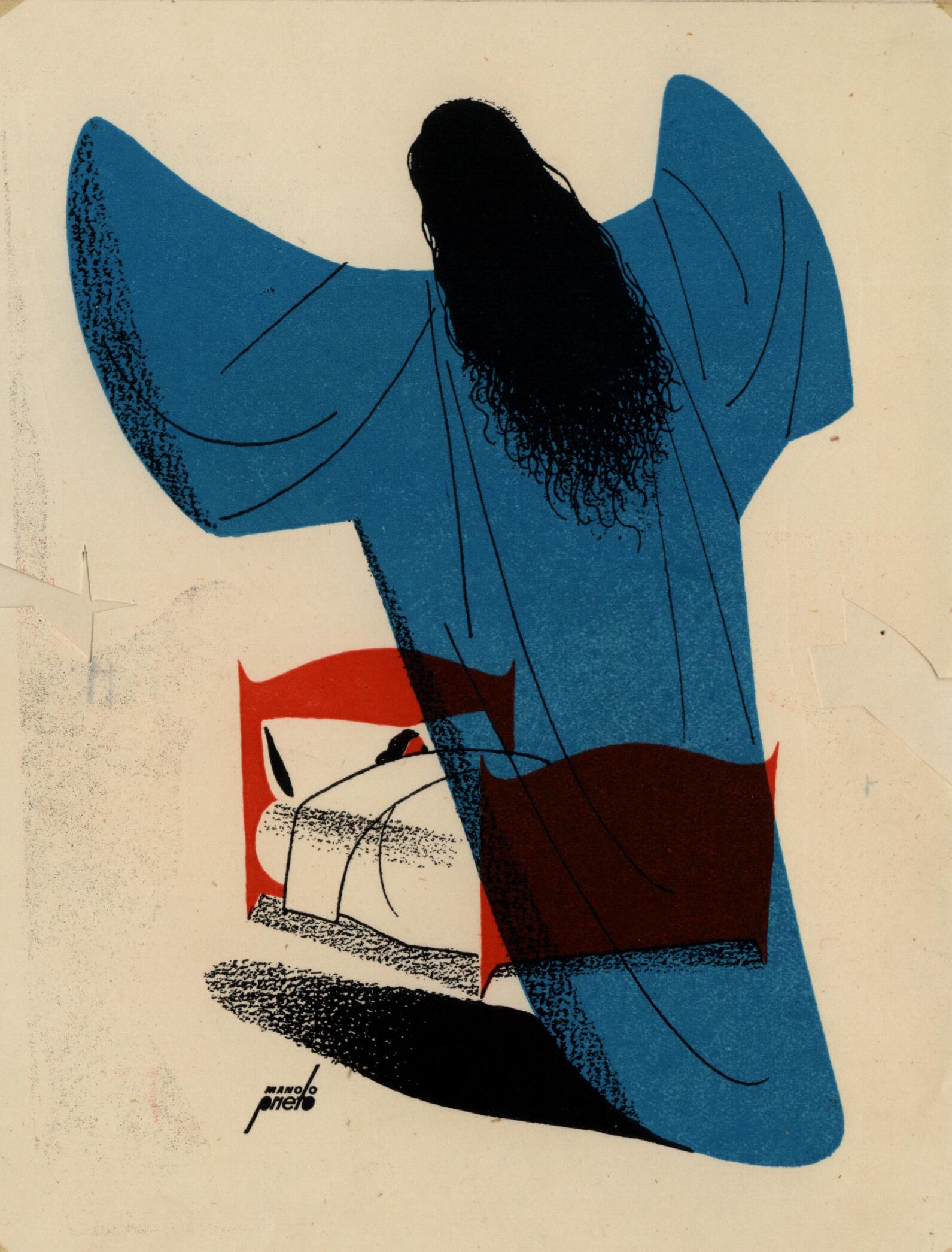 Mientras alguien duerme en la cama de sábanas blancas una figura, que se encuentra de espalda, con una larga túnica y el pelo negro suelto por la espalda vela el sueño. El dibujo está firmado.Prueba de imprenta. Ilustracion realizada para la revista semanal Novelas y Cuentos. Titulo: La dama de los rubíes. Autor: E. Marlitt. Nº publicado: 1109. Fecha: 10-08- 1952. Tomo NC. 40.