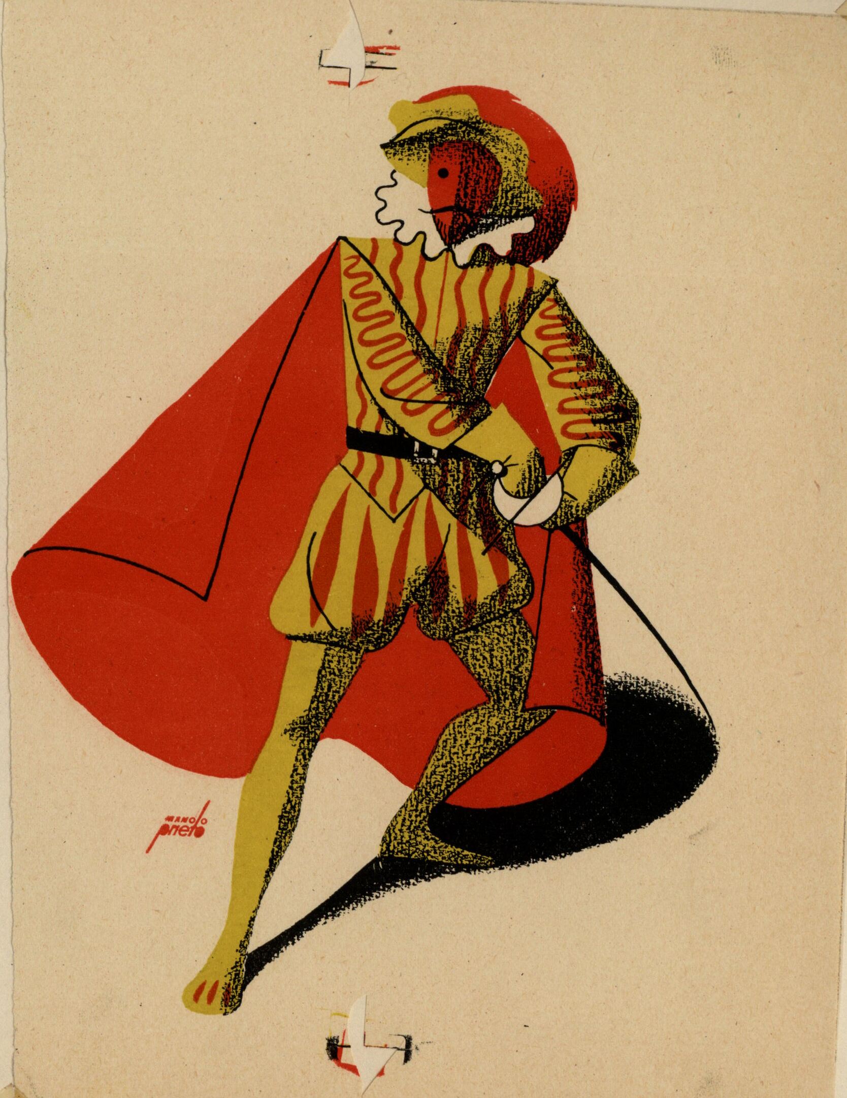 De frente y de pie se encuentra en este dibujo un espadachín pronto a coger su espada. Su traje es amarillo con rayas muy finas de color rojo en el que destaca una gran capa roja. Sobre su cabeza lleva un sombrero amarillo con una pluma roja. En el dibujo se vislumbra la firma del pintor.Prueba de imprenta. Ilustración realizada para la revista semanal Novelas y Cuentos. Ttiulo: Don Juan. Autor: Próspero Merimée. Nº publicado: 1052. Fechas: 08-07-1951. Tomo NC. 46.