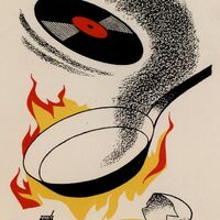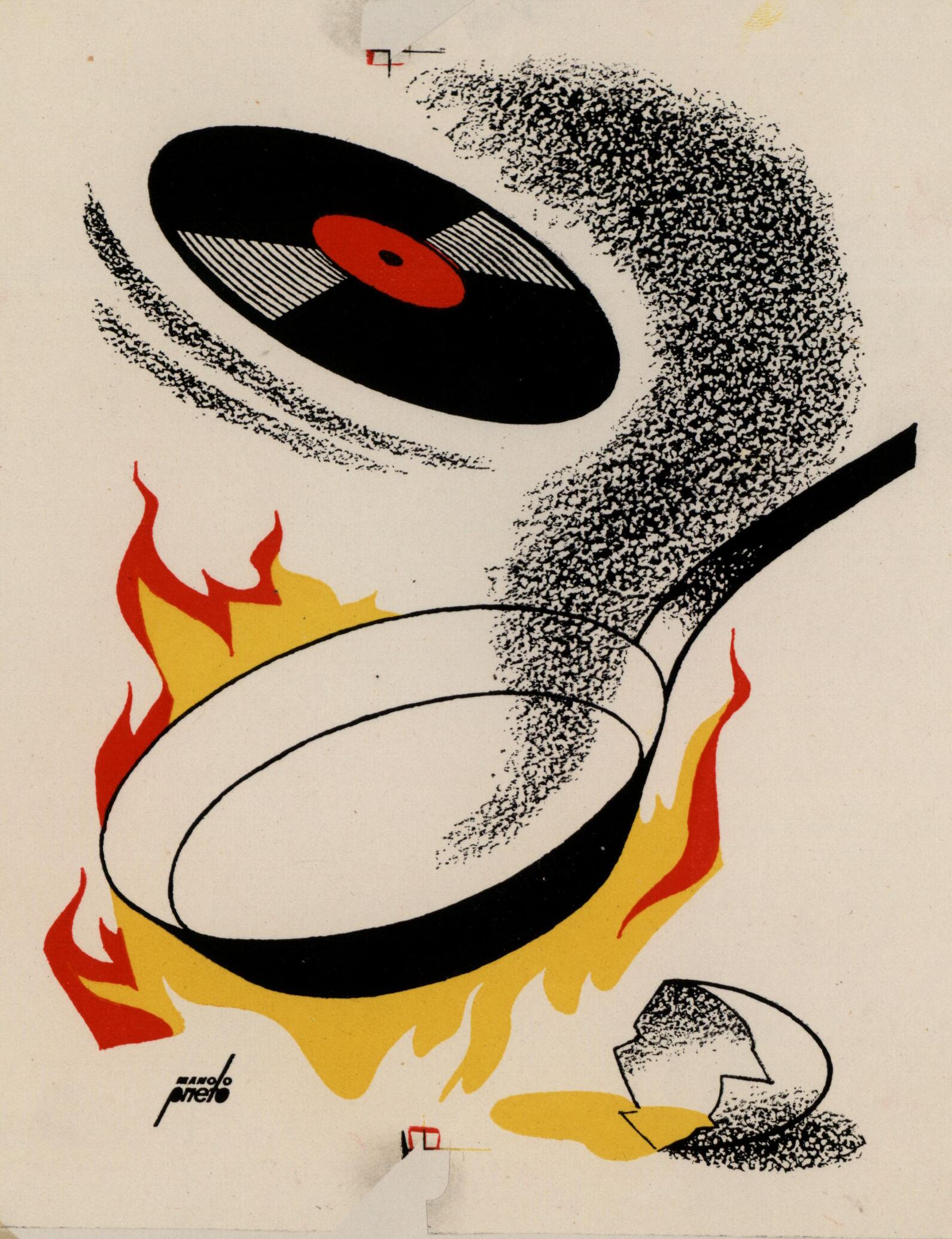 Una sartén blanca y negra se encuentra sobre unas llamas de fuego amarillas y rojas. Su tapa un disco, vuela por el aire mientras está un huevo roto en el suelo. El dibujo está firmado.Prueba de imprenta. Ilustración realizada para la revista semanal Novelas y Cuentos. Titulo: El camino del amor. Autor: A. Lichtenberger. Nº publicado: 1198. Fecha: 25- 04-1954. Tomo NC. 56.