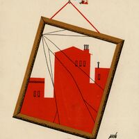 Sobre una pared se encuentra un cuadro torcido y con su cristal roto. En su lienzo tiene dibujados algunos edificios rojos con ventanas negras. El marco del cuadro es marrón. En el dibujo se halla la firma del artista.Prueba de imprenta. Ilustración realizada para la revista semanal Novelas y Cuentos. Titulo: El frágil espejo. Autor: Norat Lofts. Nº publicado: 1271. Fecha: 18-09-1955. Tomo NC. 37.