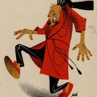 Un hombre con el pijama negro y una bata roja es cogido en su espalda al que le agarra la bata una mano que surge del lado izquierdo del dibujo firmado. La mano es de color negro.Prueba de imprenta. Ilustración realizada para la revista semanal Novelas y Cuentos. Titulo: Los buscadores de tesoros. Autor: W. Irving. Nº publicado: 1329. Fecha: 28-10 -1956. Tomo NC. 32.