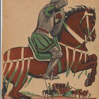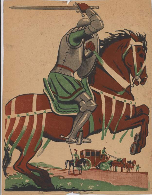 En primer plano se muestra la imagen de un guerrero con su armadura gris y túnica verde blandiendo su espada sobre un caballo marrón con adornos blancos levantando sus patas delanteras. En segundo término aparece un carro de caballos y otro caballero a caballo.Prueba de imprenta. Ilustración realizada para la revista semanal Novelas y Cuentos. Titulo: Autor: Nº publicado: Fecha: Tomo NC..