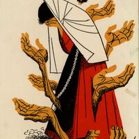 Una mujer con un manto blanco sobre su cabeza y llevando un vestido rojo y negro llora escondiendo el rostro entre sus manos. Alrededor y desde el interior de la figura surgen muchas manos huesudas de un tono amarillento todas ellas en una actitud pedigüeña. En la composición se aprecia la firma del artista.Prueba de imprenta. Ilustración realizada para la revista semanal Novelas yCuentos. Titulo: Autor: Nº publicado: Fecha: Tomo NC.