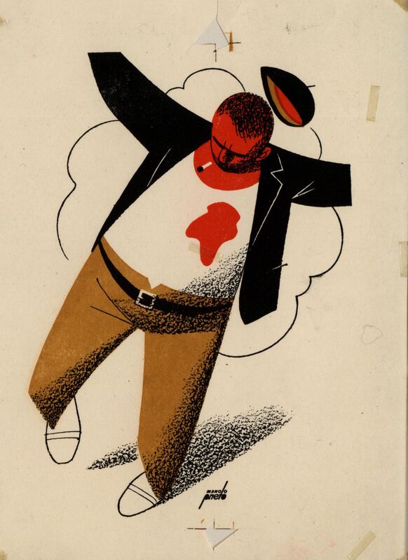 En la composición, en la que se vislumbra la firma del pintor, se ha dibujado a un personaje que se tambalea con los brazos abiertos. Lleva un pantalón marrón claro, una camiseta blanca y una chaqueta negra. Sobre la camiseta blanca se puede apreciar una mancha roja dejando adivinar una herida mortal. Sobre su cabeza lleva un sombrero negro y en su boca sostiene un cigarro.Prueba de imprenta. Ilustración realizada para la revista semanal Novelas y Cuentos. Titulo: Por un milagro de amor. Autor: J. López Saa. Nº publicado: 1298. Fecha: 25-03-1956. Tomo NC. 37.