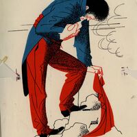 Un hombre de pelo negro que se muestra de perfil se agacha llevando su mano derecha sobre el pecho mientras que la izquierda se apoya en un pedrusco blanco. Dicho personaje lleva un pantalón rojo y una chaqueta larga de color azul. En el dibujo está presente la firma del pintor.Prueba de imprenta. Ilustración realizada para la revista semanal Novelas y Cuentos. Titulo: Demetrio Rudín (“ El enigma de un alma”). Autor: Iván Turgueniev. Nº publicado: 1189. Fecha: 21-02-1954. Tomo NC. 34.