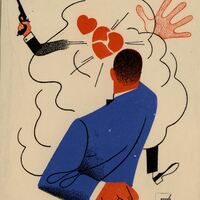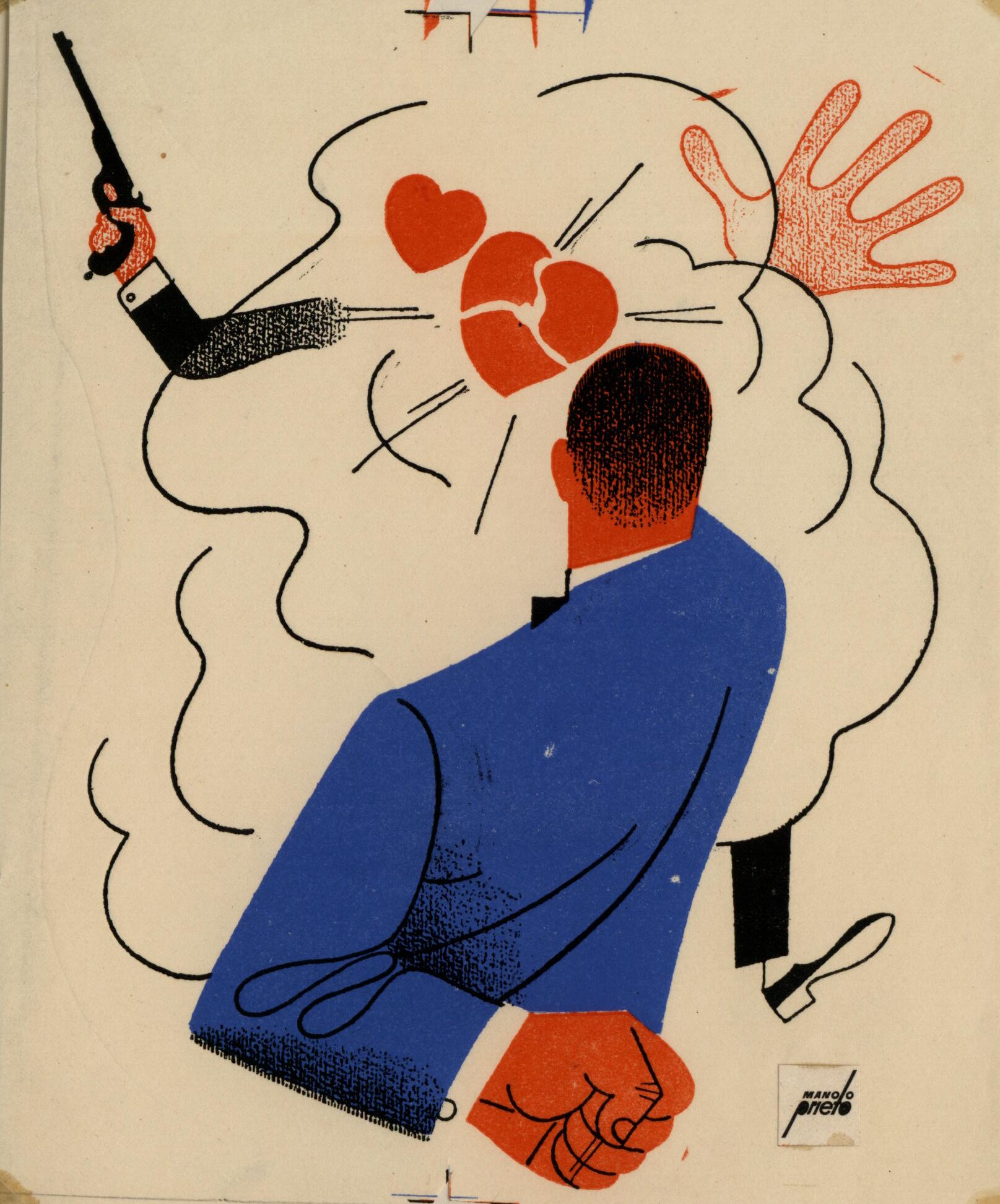 Un hombre con traje azul, al que se le ve de espalda y con una mano detrás de ella, dispara con la otra mano provocando una gran humareda en la que destacan dos corazones, uno de ellos roto, y ambos de color rojo. Por detrás de la humareda, que toma un color blanco creada con líneas negras, se vislumbra una figura humana de la que solamente se ven un brazo cogiendo una pistola, una mano y una pierna. En el dibujo está presente la firma del pintor.Prueba de imprenta. Ilustración realizada para la revista semanal Novelas y Cuentos. Titulo: El corazón secuestrado. Autor: Gaston Leroux. Nº publicado: 1023. Fecha: 17-12-1950. Tomo NC. 58