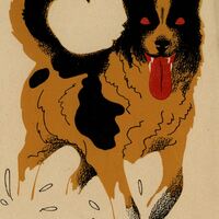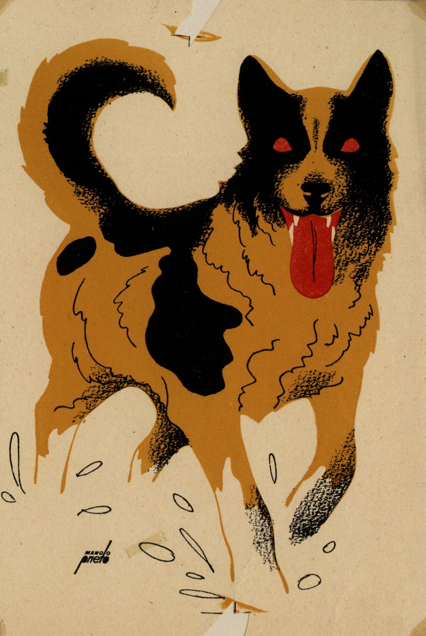 La figura central de esta composición firmada es un perro marrón con manchas negras por su cuerpo. El animal aparece de frente, tiene los ojos rojos y lleva la lengua roja fuera de su boca.Prueba de imprenta. Ilustración realizada para la revista semanal Novelas y Cuentos. Titulo: La llamada de la selva. Autor: Jack London. Nº publicado: 1060. Fecha: 02-09-1951. Tomo NC. 60