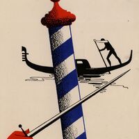 En primer plano se vislumbran una mano que sostiene una espada y una columna decorada con líneas blancas y azules con el tejadillo rojo. En segundo plano se ve la figura en negro de un gondolero conduciendo su barco. En el dibujo está presente la firma del pintor.Prueba de imprenta. Ilustración relizada para la revista semanal Novelas y Cuentos. Titulo: El Bravo. Autor: Fenimore Cooper. Nº publicado: 1219. Fecha: 19-09-1954. Tomo NC. 59.