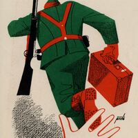 Un hombre al que se ve de espalda con un traje verde corre llevando sobre su hombro una escopeta mientras que en una de sus manos sostiene un maletín rojo. Una mano con la silueta roja aparece en primer término.Prueba de imprenta. Ilustración realizada para la revista semanal Novelas y Cuentos. Titulo: Los pendientes de la muerta. Autor: P. Wentworth. Nº publicado: 1124. Fecha: 25-11-1952. Tomo NC. 35.