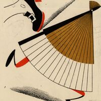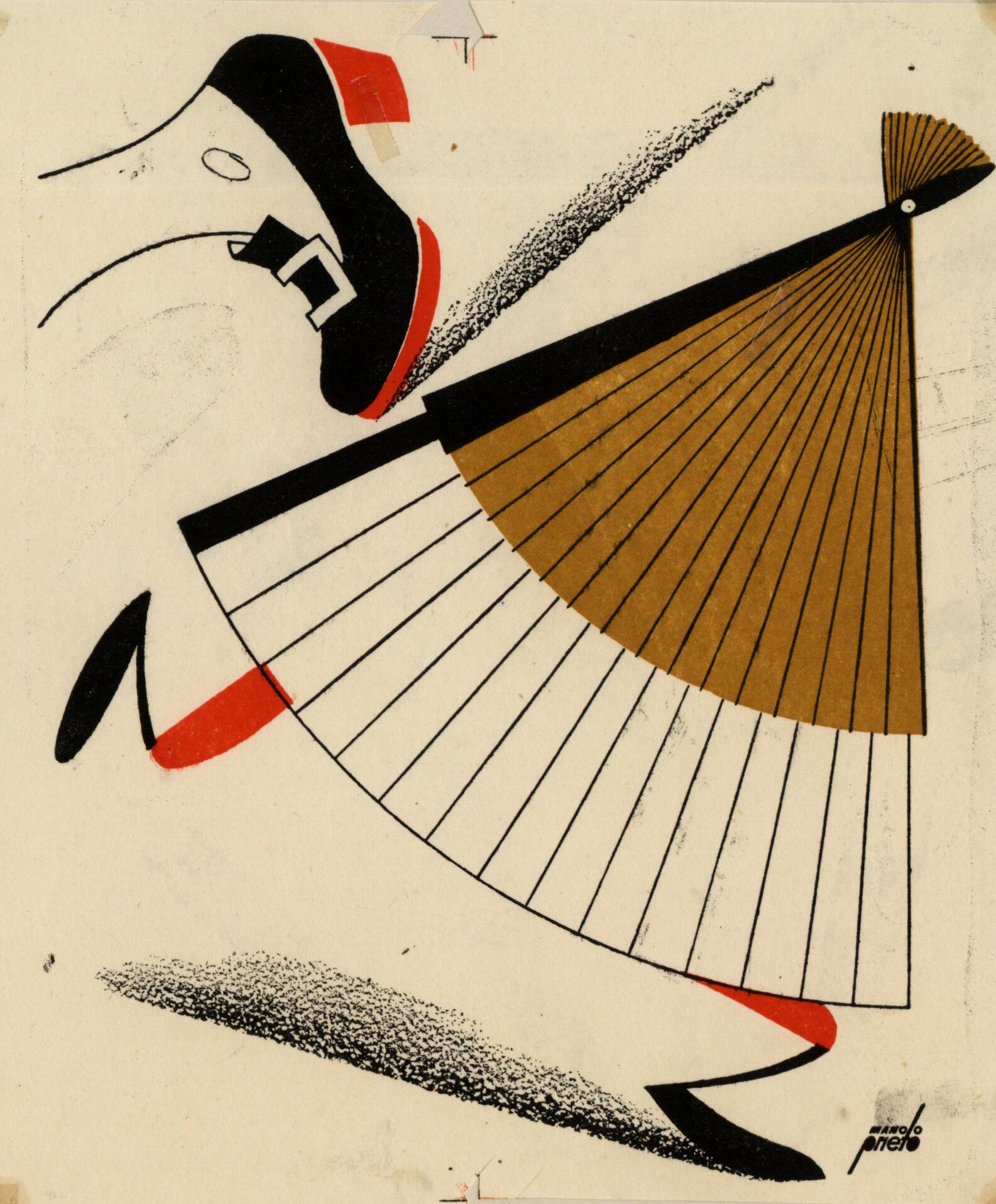 En este dibujo firmado se ve un abanico blanco y marrón al que se le han pintado piernas corriendo. A su lado derecho se ve la bota de un hombre de color negro con tacón rojo y una hebilla blanca.Prueba de imprenta. Ilustración realizada para la revista semanal Novelas y Cuentos. Titulo: El abanico. C. Goidoni. Nº publicado: 1277. Fecha: 30-10-1955. Tomo NC. 32.