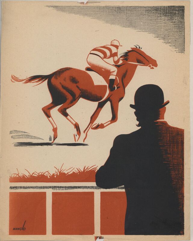 - Apoyado sobre una barandilla roja y blanca aparece la imagen de un hombre de espalda con el traje y sombrero oscuros observando como corre un jinete sobre su caballo marrón. El dibujo está firmado.Prueba de imprenta. Ilustración realizada para la revista semanal Novelas y Cuentos. Titulo: Autor: Nº publicado: Fecha: Tomo NC.: