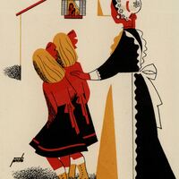 Dos niñas rubias con el traje rojo y negro son conducidas por la niñera que lleva el uniforme blanco y negro. Las tres figuras están de perfil y parecen observar una figura que surge en la ventana de una casa blanca. La composición está firmada.Prueeba de imprenta. Ilustración realizada para la revista semanal Novelas y Cuentos. Titulo: El triunfo de la huída. Autor: D. E. Stevenson. Nº publicado: 1159. Fecha: 26- 07-1953. Tomo NC. 55.