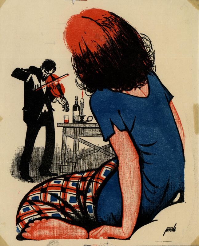 Una mujer de espalda con el pelo rojizo, una camiseta azul y una falda con dibujos parece observar como un hombre, que aparece en segundo plano, toca el violín. Al lado del hombre hay una botella, un vaso y un candelabro con una vela encendida. El dibujo está firmado.Prueba de imprenta. Ilustración realizada para la revista semanal Novelas y Cuentos. Titulo: Nietotchka Nezvanova; Autor: Hedor Dostoiesky; Nº publicado: 996; Fecha: 11-06-50; Tomo NC. 39.