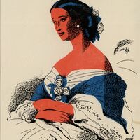 En este retrato se ha representado a una mujer sentada con las manos sobre su regazo. Lleva un vestido de gran riqueza de color blanco con detalles en azul y el pelo negro, que adquiere tonos azulados, lo recoge en un elegante peinado. La firma del pintor está presente en este dibujo.Prueba de imprenta. Ilustración realizada para la revista semanal Novelas y Cuentos. Titulo: Autor: Nº publicado: Fecha: Tomo NC.