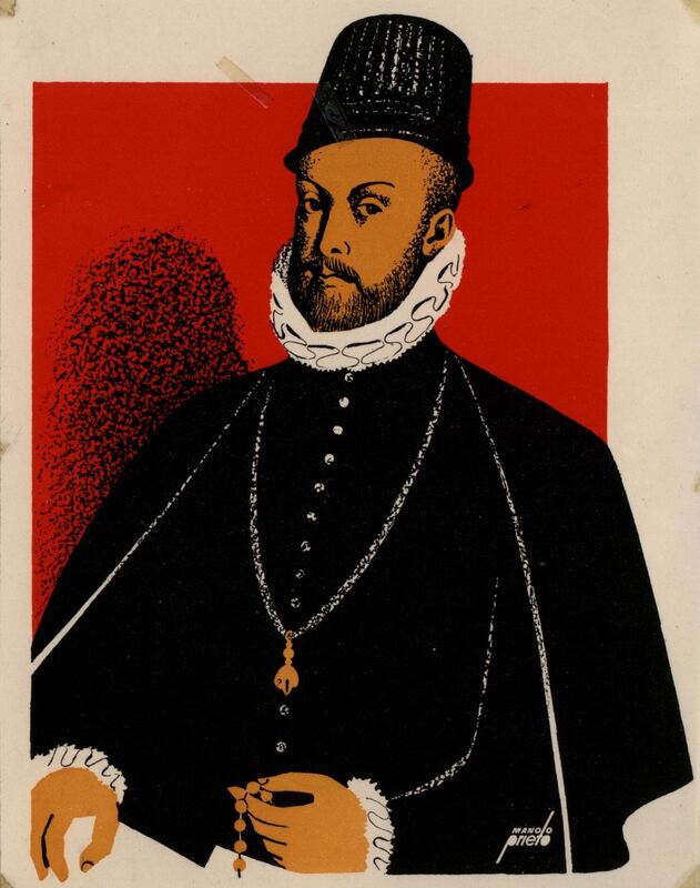 En este retrato, en posición sedente, se ha representado a Felipe II con un traje negro, gola blanca y un gorro alto, también negro, sobre su cabeza. En una de sus manos parece sostener un rosario. La figura está de frente y su semblante es serio. En el fondo del retrato destaca el color rojo. El dibujo está firmado.Prueba de imprenta. Ilustración realizada para la revista semanal de Novelas y cuentos. Titulo: Autor: Nº publicado: Fecha: Tomo NC.