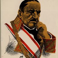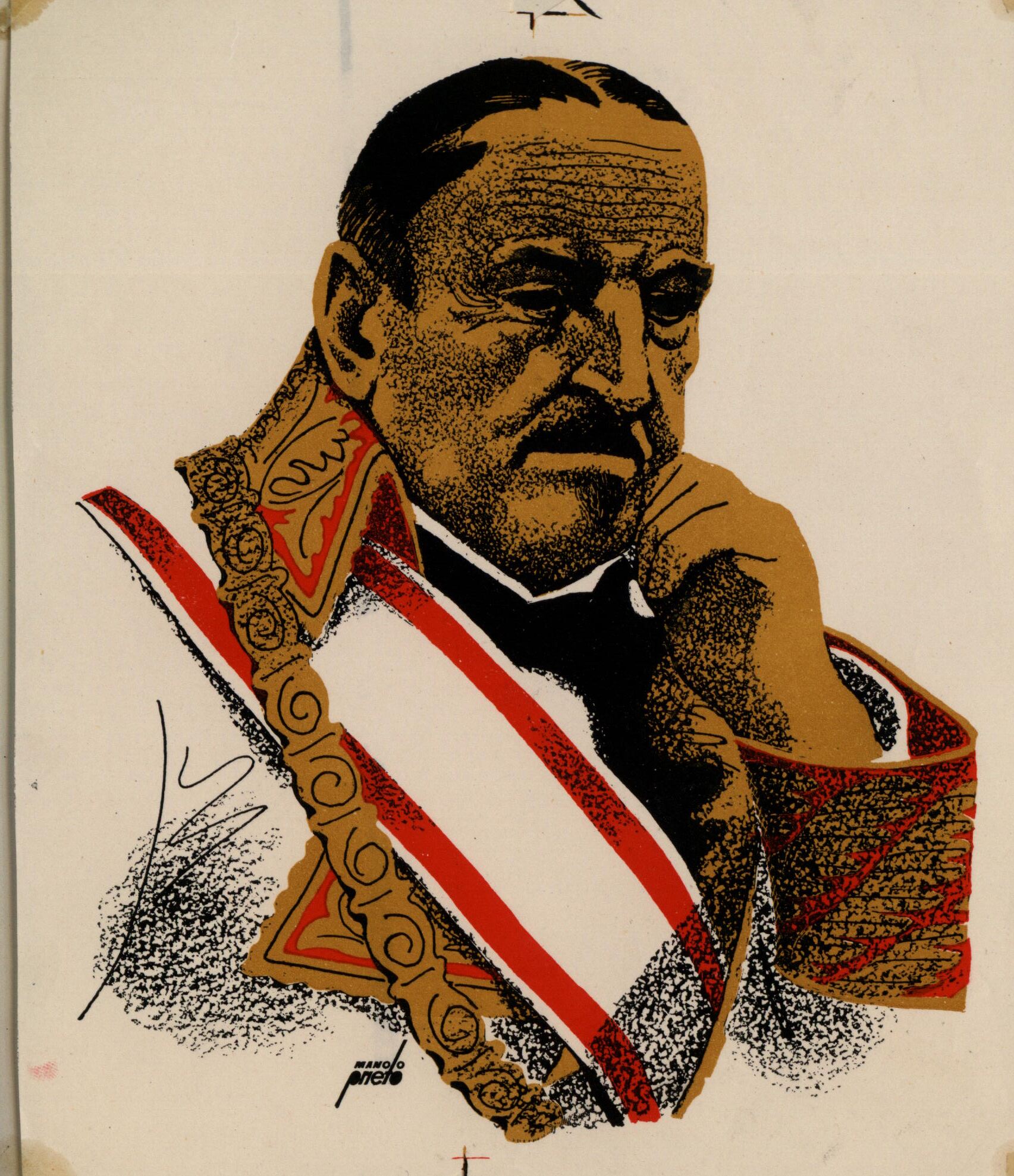 Un hombre, probablemente un alto cargo del estado o del ejército, con el traje blanco con adornos dorados y rojos se encuentra representado en este retrato. Su cabeza la apoya en una mano y su semblante es serio. La figura se muestra de frente. En la composición está presente la firma del pintor.Prueba de imprenta. Ilustración realizada para la revista semanal Novelas y Cuentos. Titulo: Autor: Nº publicado: Fecha: Tomo NC.