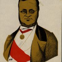 El busto de un hombre de frente se ha representado en este retrato firmado. Lleva una camisa blanca sobre la que lleva una banda de color rojo. Una chaqueta marrón se sitúa sobre la camisa. El personaje masculino tiene una piel oscura y una pequeña barba le crece en el rostro en el que también se destacan unas gafas. Una medalla dorada le cuelga del cuello.Prueba de imprenta. Ilustración realizada para la revista semanal de Novelas y Cuentos. Titulo: Autor: Nº publicado: Fecha: Tomo NC.