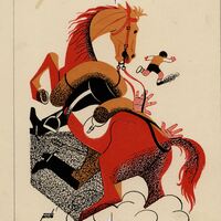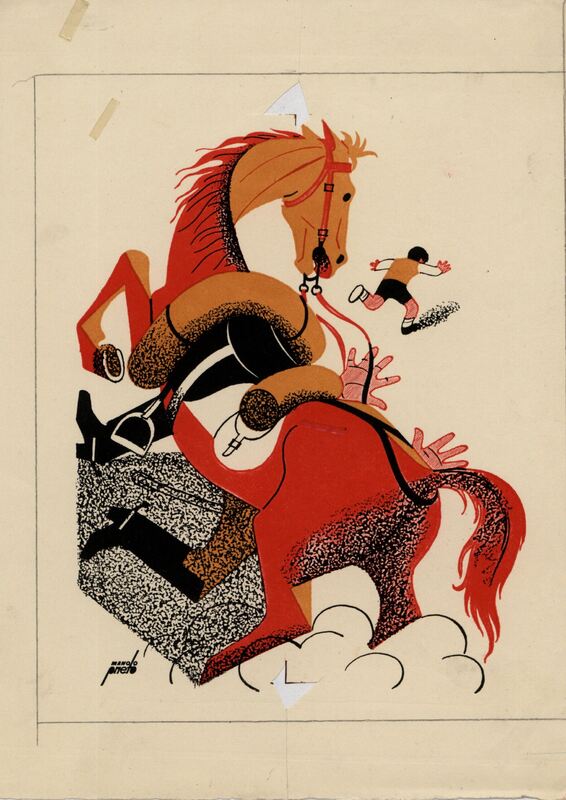 En este dibujo enmarcado y firmado destaca un caballo rojizo haciendo movimientos bruscos y aplastando a su jinete, del que solamente se ven sus manos y piernas. En segundo plano se ve un niño corriendo apresuradamente con pantalón negro y camiseta amarilla.Prueba de imprenta. Ilustración realizada para la revista semanal de Novelas y Cuentos. Titulo: El espía del emperador. Autor: Charles Laurent. Nº publicado: 1146. Fecha: 26-04-1956. Tomo NC. 41