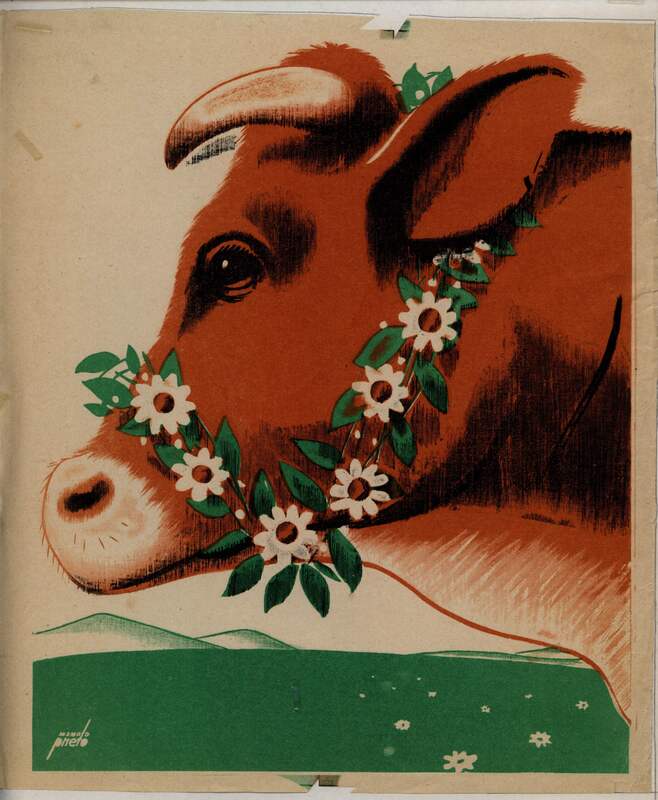 En este dibujo firmado, en el que el color verde está presente por los pastos que se vislumbran en el fondo de la composición, se ha representado la cabeza de perfil de una vaca marrón a la que se ha adornado con una corona de flores blancas y hojas verdes.Prueba de imprenta. Ilustración realizada para la revista semanal de Novelas y Cuentos. Titulo: Autor: Nº publicado: Fecha: Tomo NC.