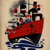 En un barco negro y rojo con grandes chimeneas de las que se desprende un humo negro se ven numerosos pasajeros con paraguas y trajes negros mirando por la borda. En la proa del barco un hombre mira por un catalejo. El barco navega sobre aguas blancas y azules. Es una composición firmada.Prueba de imprenta. Ilustración realizada para la revista semanal de Novelas y Cuentos. Titulo: Port Tarascón ( Ultimas aventuras del ilustre Tartarin. ); Autor: Alfonso Daudet; nº public.: 939; Fecha: 08-05-49; Tomo: 11; boc. 368.