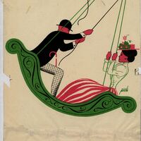 Un hombre y una mujer, sentados cada uno en un extremo del balancín verde, se balancean. Él lleva un traje negro y gris y sombrero mientras que ella lleva una falda blanca con rayas rosas y un corpiño verde, también lleva un sombrero de flores sobre su cabeza. Las dos figuras se hallan de perfil. La composición está firmada.Prueba de imprenta. Ilustración realizada para la revista semanal de Novelas y Cuentos. Titulo: Autor: Nº publicado: Fecha: Tomo NC.