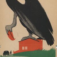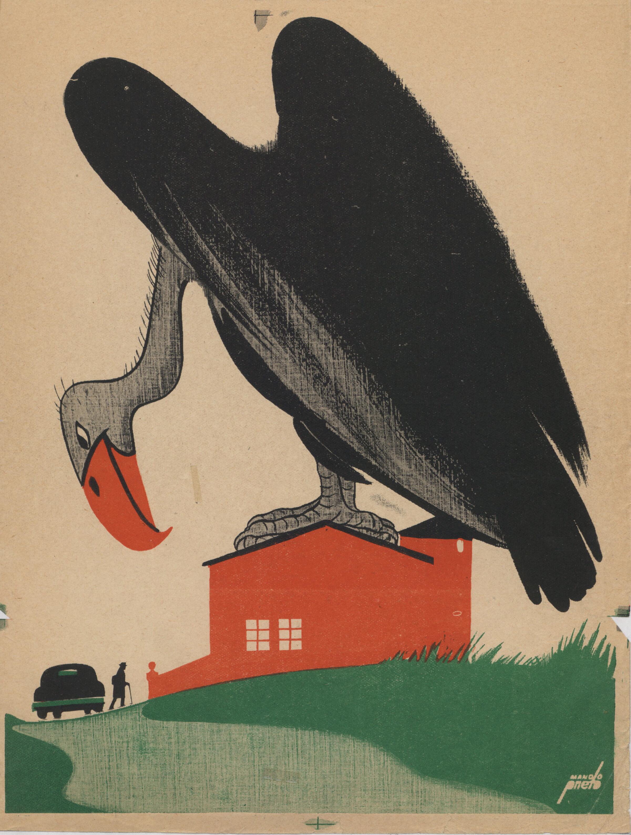 Sobre una casa naranja se encuentra posado un gran buitre gris, con alas negras y pico naranja. Al lado de la casa hay un coche y alguna persona. Alrededor de la casa se ve un paisaje verde. El dibujo está firmado.Prueba de imprenta. Ilustración realizada para la revista semanal de Novelas y Cuentos. Titulo: El gran negocio en brillantes. Autor: Wiliam Magnay. Nº publicado: 849. Fecha: 17-08-1947. Tomo NC. 54.