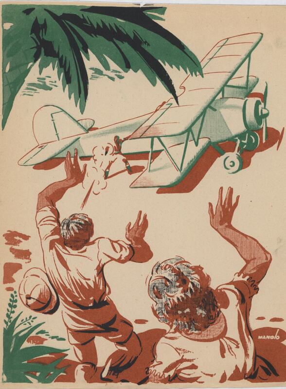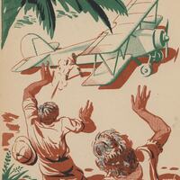 En segundo plano se puede vislumbrar la imagen de un aeroplano, situado al lado de las alas del avión un hombre disparando, mientras que en primer término surgen un hombre y una mujer asustados ante la visión de un hombre que esta disparando alcanzando al hombre de espaldas. Las dos figuras se ven de espalda y a su lado derecho destaca una palmera de hojas verdes.Prueba de imprenta. Ilustración realizada para la revista semanal Novelas y Cuentos. Titulo: Autor: Nº publicado: Fecha: Tomo NC.: