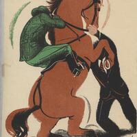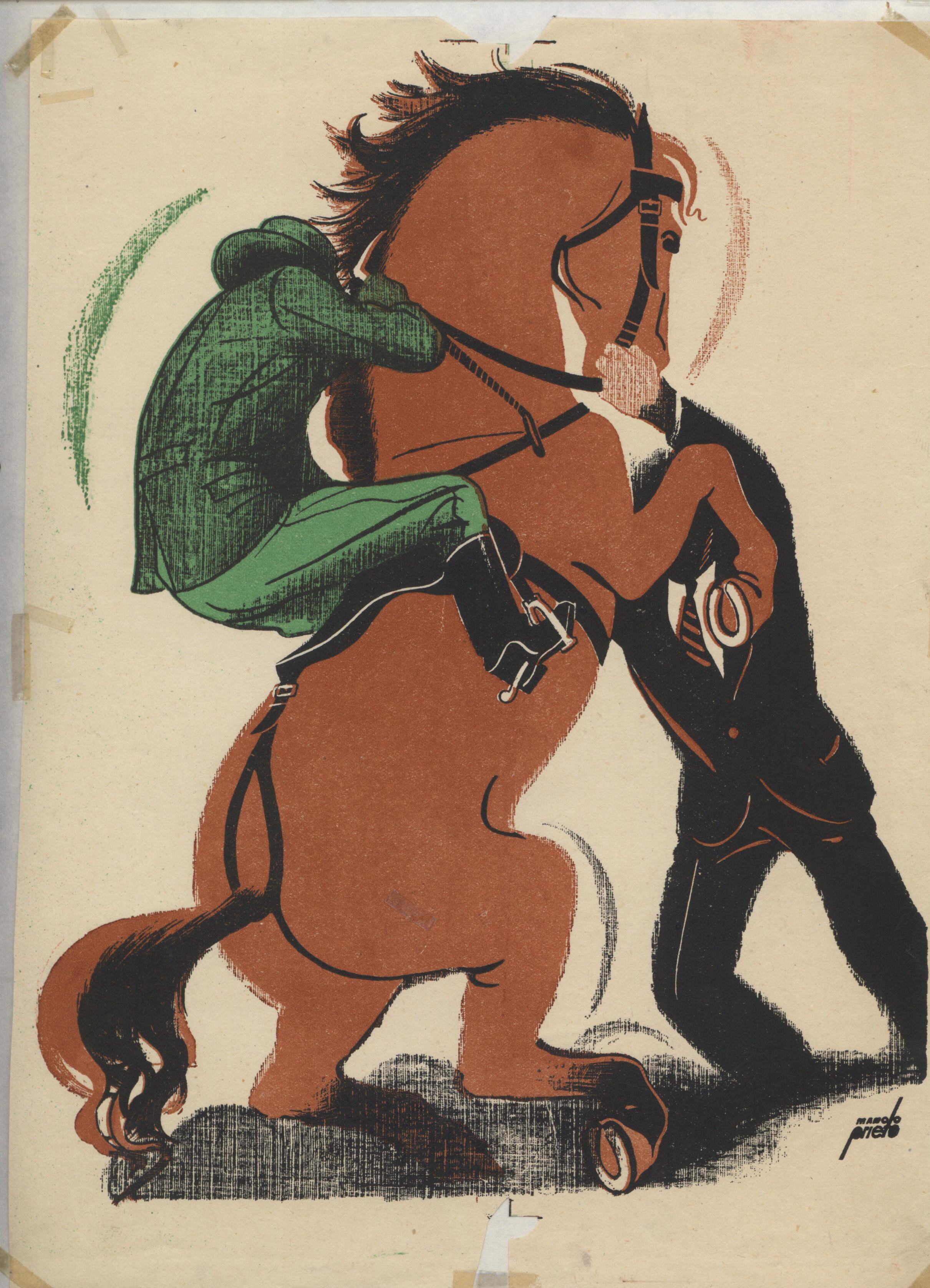 Un caballo marrón montado por un jinete de traje verde y que aparece de espalda es dominado por un hombre de traje negro que le sujeta las bridas mientras el caballo levanta sus patas delanteras. En la composición se halla la firma del artista.Prueba de imprenta. Ilustración realizada para la revista semanal de Novelas y Cuentos. Titulo: El misterio de la carretera de cintra. Autor: Ega de Queiroz. Nº publicado: 882. Fecha: 04-04-1948. Tomo NC. 5.
