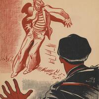 En este dibujo firmado se ven dos imágenes: sobre el fondo de una pared roja se apoya un hombre que parece fugitivo huyendo de un policía con su traje oscuro y gorra que aparece en primer término y de espalda.Prueba de imprenta. Ilustración para la revista semanal Movelas y Cuentos. Titulo: Policías y Ladrones. Autor: John Rousell. Nº publicado: 767. Fecha: 20-01-1946. Tomo NC.: 7