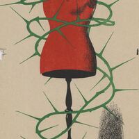 Un modelo rojo sobre un palo negro con tres piernas en su parte inferior se encuentra en el centro de esta composición firmada. La figura es cubierta por una línea en forma de espiral de la que sobresalen grandes pinchos.Prueba de imprenta. Ilustración realizada para la revista semanal de Novelas y Cuentos. Titulo: El marido de la modista. Autor: Henri Duvernois. Nº publicado: 903. Fecha: 29-08-1948. Tomo NC.: 6.