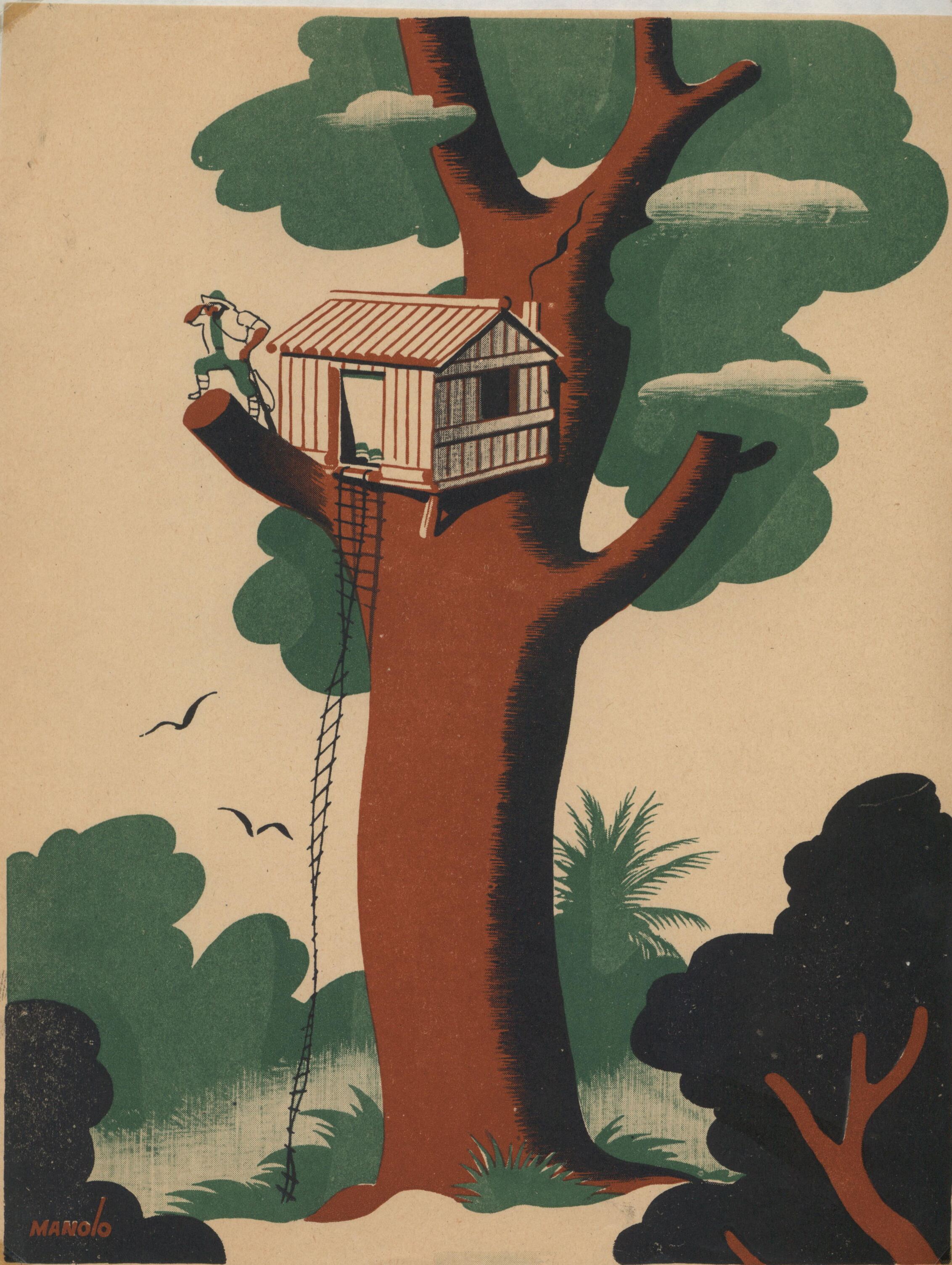 Sobre un árbol de tronco muy largo y verdes hojas se halla construida una casa de madera. Sobre una rama y al lado de la casa se ve la diminuta figura de un hombre. Alrededor de este árbol se puede ver más vegetación. Está presente la firma del pintor en el dibujoPrueba de imprenta. Ilustración realizada para la revista semanal Novelas y Cuentos. Titulo: Autor: Nº publicado: Fecha: Tomo NC.: