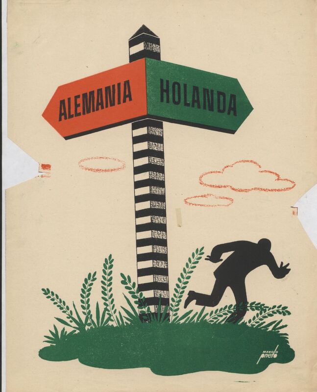 En el dibujo firmado destaca una señal en la que está escrito Alemania sobre un fondo rojo, hacia la derecha, y Holanda sobre un fondo verde, hacia la izquierda. El palo de la señalización es a rayas negras y blancas. Un hombre corre en un segundo plano.Prueba de imprenta. Ilustración realizada para la revista semanal de Novelas y Cuentos. Titulo: La fiera en acecho. Autor: Valentine Willians. Nº publicado: 946. Fecha: 26-06-1949. Tomo NC.: 3.