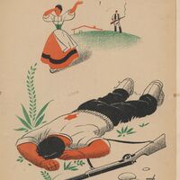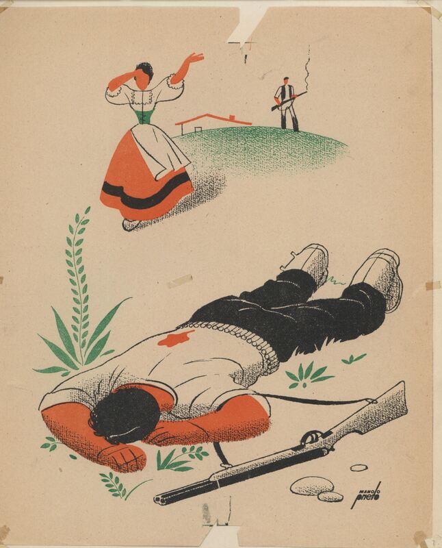 Un hombre muerto yace en el suelo. En un segundo plano se ve una mujer con una actitud desesperada ante el suceso. Y sobre una colina un hombre con una escopeta observa la escena. El hombre tendido en el suelo lleva un pantalón negro y camiseta blanca. Sobre su espalda se ve la herida. El dibujo está firmado.Prueba de imprenta. Ilustración realizada para la revista semanal de Novelas y Cuentos. Titulo: Mariana Sirca. Autor: Grazia Deledda. Nº publicado: 935. Fecha: 10-04-1949. Tomo NC.: 10
