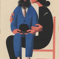 Una mujer sentada sobre una silla rosa, con un traje negro y de perfil besa la mejilla de un hombre barbudo que está sentado sobre su regazo y en una posición frontal. Su traje es azul y sujeta en sus manos un sombrero negro. En la composición esta presente la firma del pintor.Prueba de imprenta. Ilustración realizada para la revista semanal de Novelas y Cuentos. Titulo: Autor: Nº publicado: Fecha: Tomo NC.